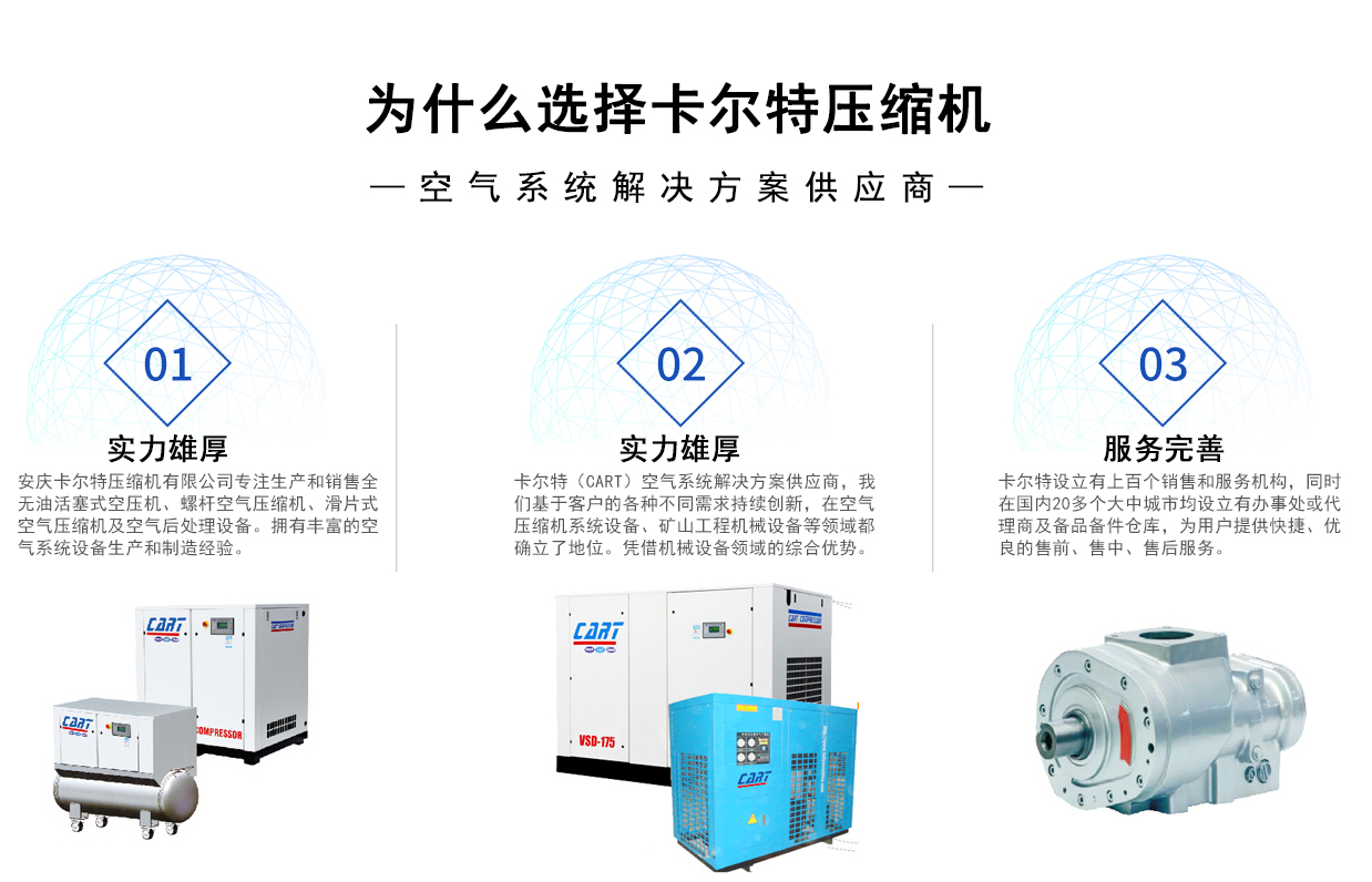 安慶卡爾特壓縮機(jī)專注全無油活塞式空壓機(jī)、螺桿空氣壓縮機(jī)、滑片式空氣壓縮機(jī)及空氣后處理設(shè)備。